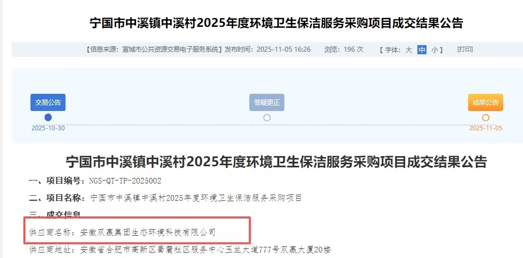 近日,安徽双赢集团生态环境科技有限公司成功中标“宁国市中溪环卫保洁服务项目”,合同期三年。